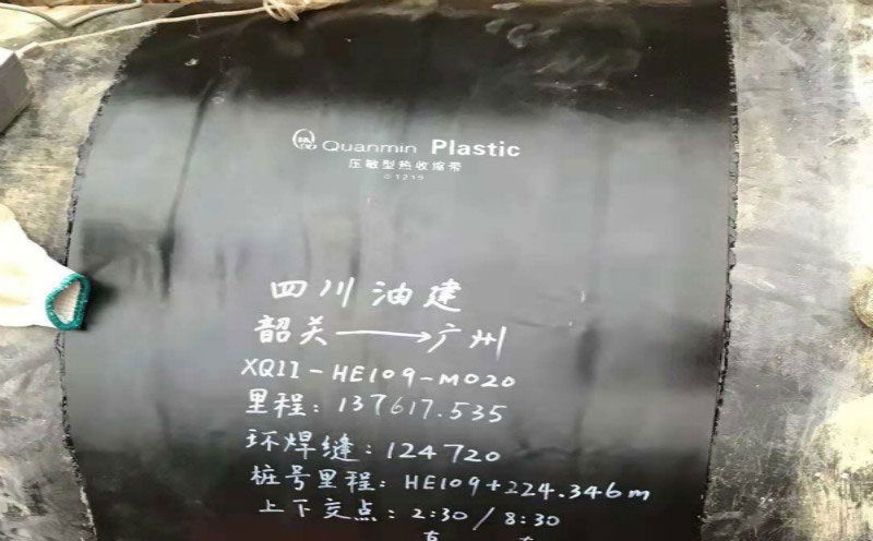 3、沿管徑環繞熱縮壓敏帶后,先將固定片通過加熱,粘接在適應的壓敏膠熱收縮帶接頭部位,形成筒狀。隨后移離需作業段,用火焰沿周向均勻加熱,達到收縮。隨之再沿徑向分別向兩側加熱,受熱力作用收縮,內層熱膠同時熔化包覆填充于作業表面,與管道防腐層形成緊密連續的防腐蝕保護體系。